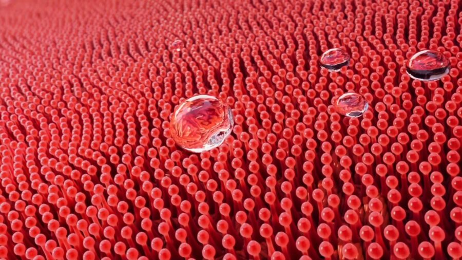 その寝てしまった柱たちに熱を加えると、倒れた柱が再び起き上がって整列する(=撥水復活)という性質があります。
