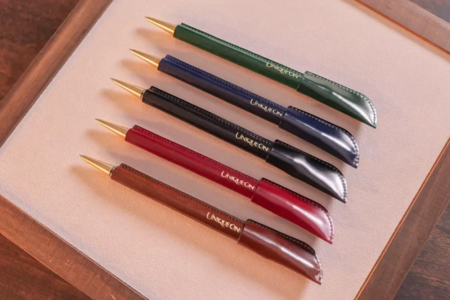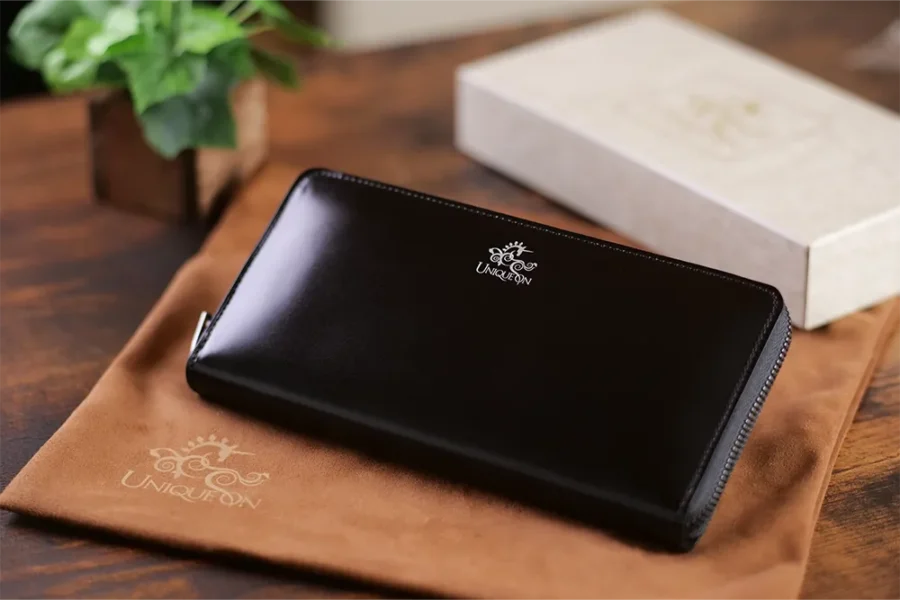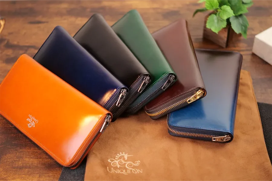 UNIQUEONのラインナップは、長財布・二つ折り財布・コインケース・名刺入れ・キーケース・ペンケースなど、コードバンを用いた革小物が中心です。