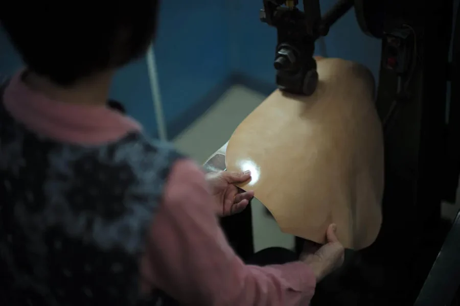 脂入れ・伸ばしミモザ100%のタンニンなめし革に、創業者独自レシピの脂を一枚ずつ手作業で入れる。湿度・温度・革の状態に応じ、油分と水分の量を職人が調整。