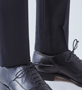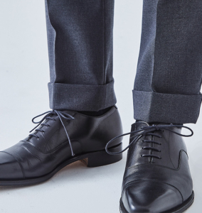 パンツの股下丈は、靴を履いた際にハーフクッション(僅かにパンツの裾が靴に“乗って”クッションができる:写真中央参照)くらいがベストです。
