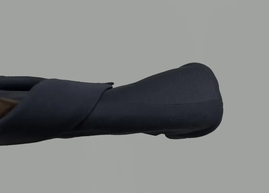 これはウン十万円するスーツのジャケットでもよくある仕様ですが、どうしても生産性重視のスーツの場合、袖が外側に広がってしまうような付き方になってしまいます。